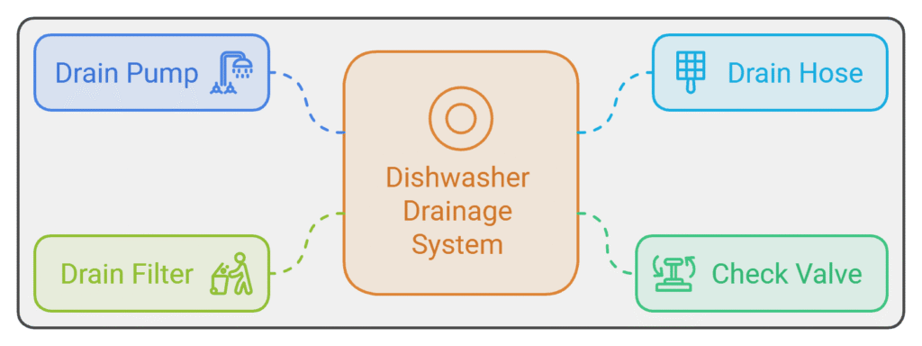 These elements work together to remove water and food particles from the dishwasher. The filter traps debris, the pump forces water out, the hose carries it away, and the air gap prevents backflow.