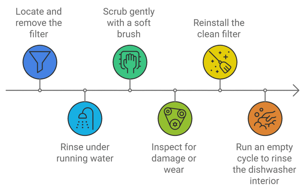 Filters play an important role in your dishwasher’s drainage system. Regular maintenance involves thoroughly cleaning the filter to guarantee ideal performance.